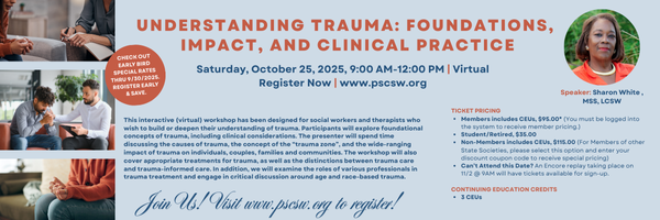 FOR PENNSYLVANIA SOCIAL WORKERS, MARRIAGE AND FAMILY THERAPISTS, AND PROFESSIONAL COUNSELORS: This program is approved for 3 Credits for professional workshops sponsored by the Pennsylvania Society for Clinical Social Work, a state affiliate of the Clinical Social Work Association listed in Section 47.36 of Title 49, Chapter 47 of the PA Code, State Board of Social Work Examiners.